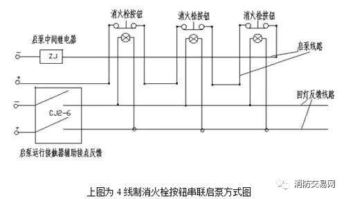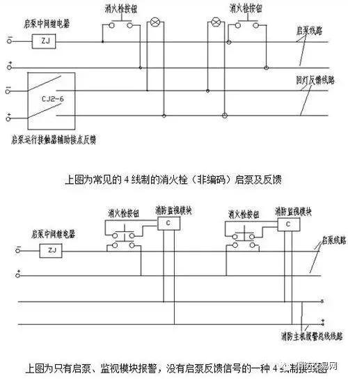 1)4線制按鈕串聯(lián)啟泵常見的方式:啟泵回燈各2根線,啟泵時所用的消火栓按鈕回燈都會點亮,沒有報警信號。