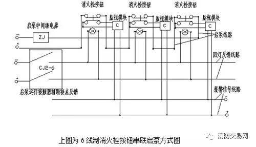 2)6線制按鈕串聯(lián)啟泵常見的方式:啟泵、回燈、報警各2根線,啟泵時所用的消火栓按鈕回燈都會點亮,有報警信號。